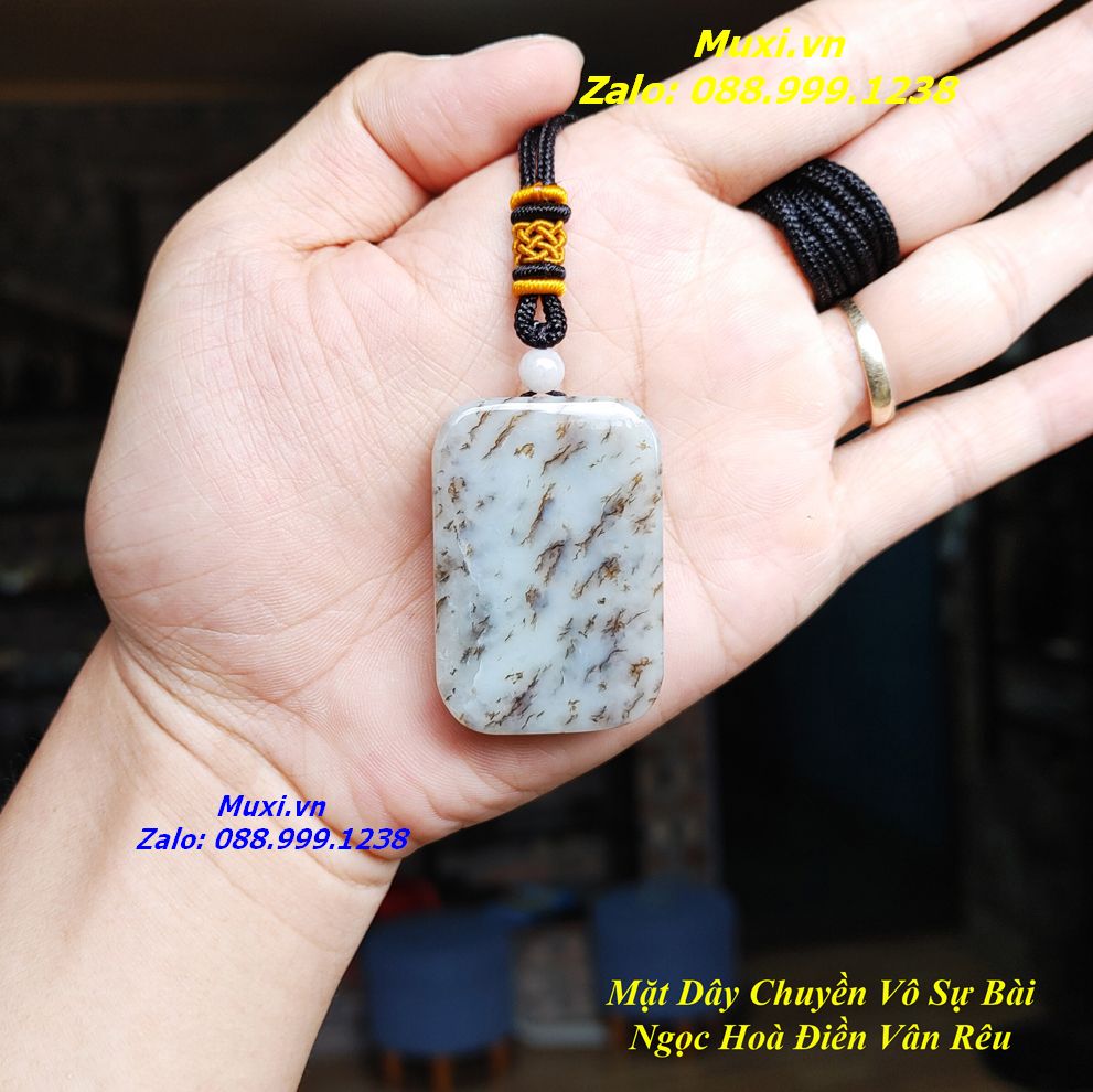 Bộ sản phẩm gồm: 1 mặt dây chuyền vô sự bài ngọc hoà điền vân rêu tự nhiên, dây đeo, túi nhung đỏ, hộp đựng sang trọng.