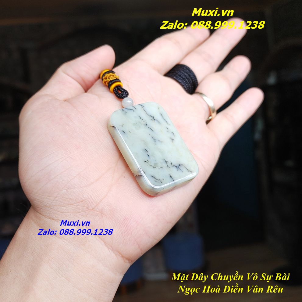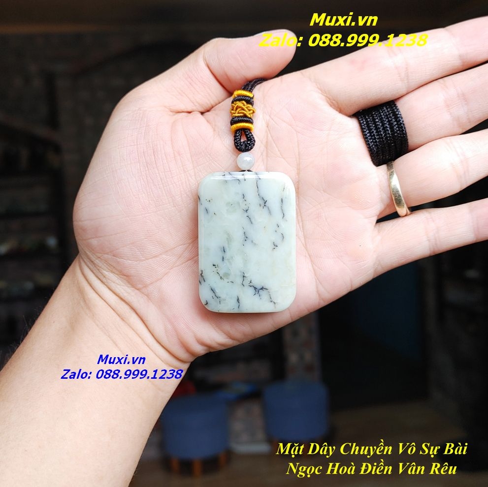 Bộ sản phẩm gồm: 1 mặt dây chuyền vô sự bài ngọc hoà điền vân rêu tự nhiên, dây đeo, túi nhung đỏ, hộp đựng sang trọng.